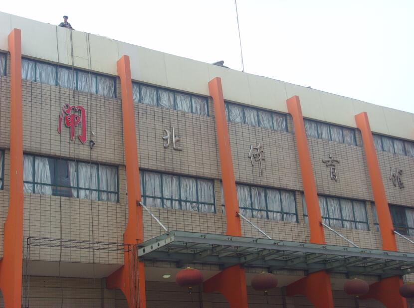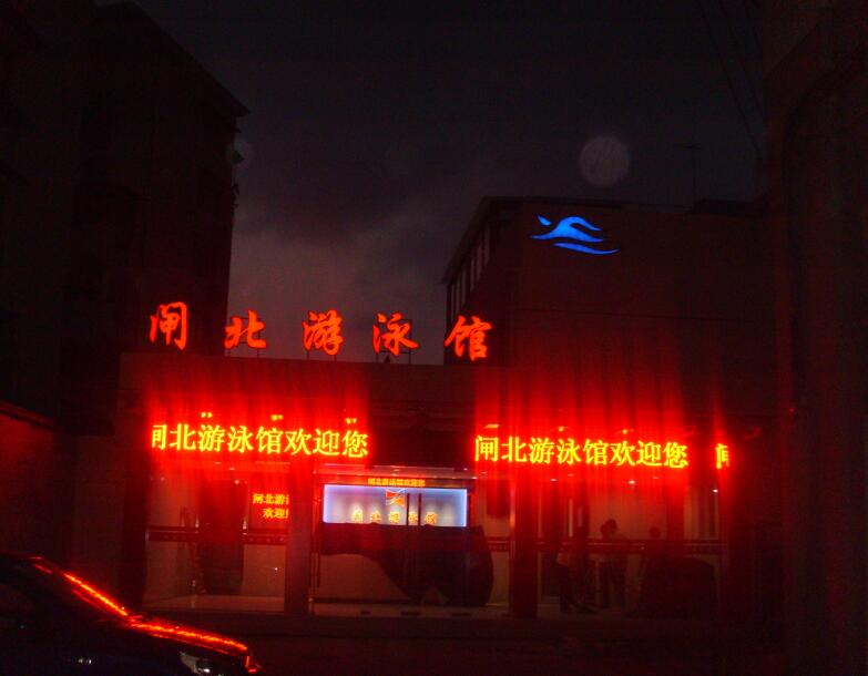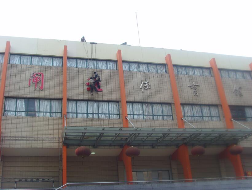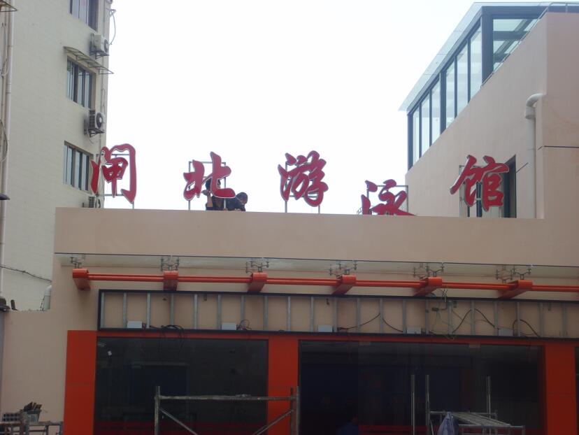 工人正在拆除原有铜字及安装新字体 安装完成的整体效果 侧边游泳馆发光字安装