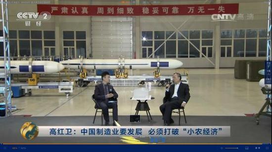 访谈进行中,主持人和访谈嘉宾(高红卫董事长)背后是安放在小车上的正在装配的巡航导弹,整个节目中这些自动化控制的小车不断缓慢前后移动,非常抢镜