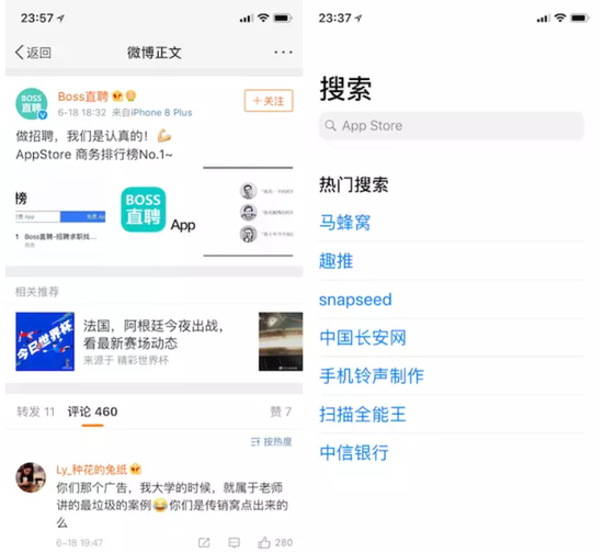 Boss 直聘 6 月 18 日发了条微博,说自己登上 AppStore 商务类免费排行榜第一(现在已经降到第三)。这条微博下面的评论依然是一片骂声。