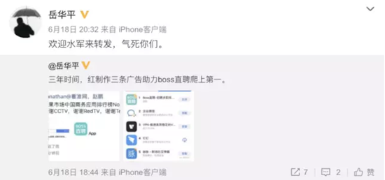网上的批评出现后,岳华平在微博上转发了网友制作的恶搞图:“欢迎水军来转发,气死你们。”以及“三年时间,红制作三条广告助力 boss 直聘爬上第一。”